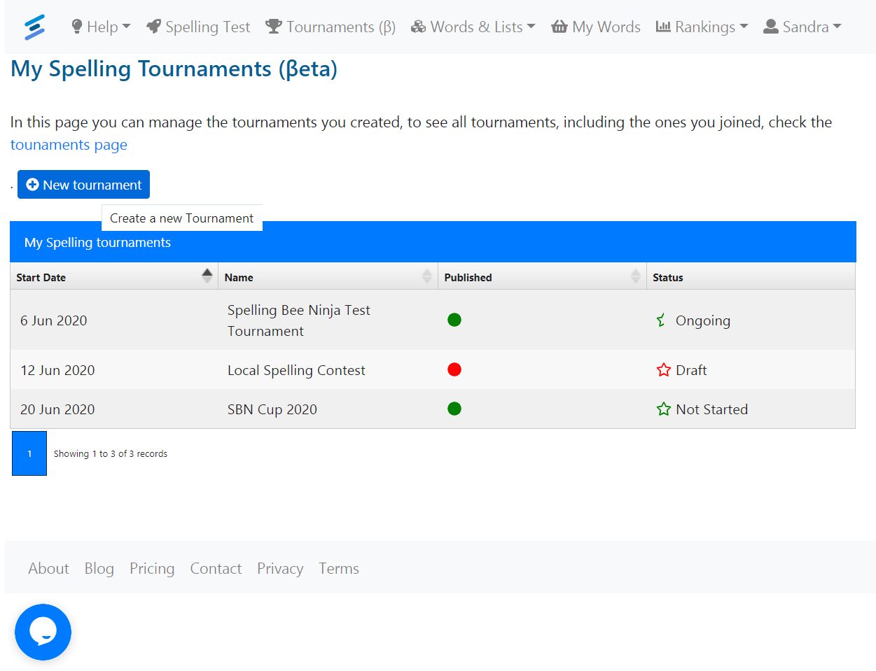 Every registered user will be able to organize and hold a real spelling bee tournament, inviting his friends or students to participate. To create your first tournament just reach out the My Tournament section under your account Menu and click New Tournament Button.