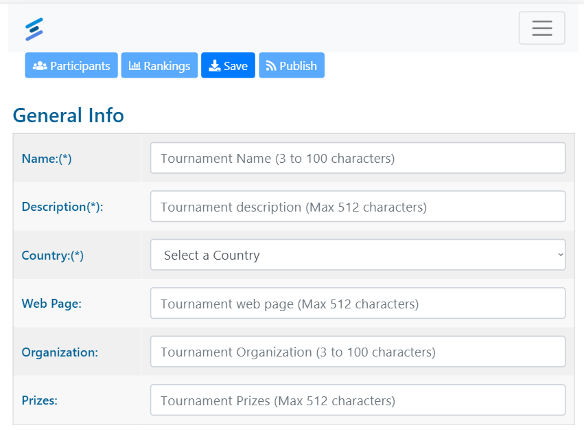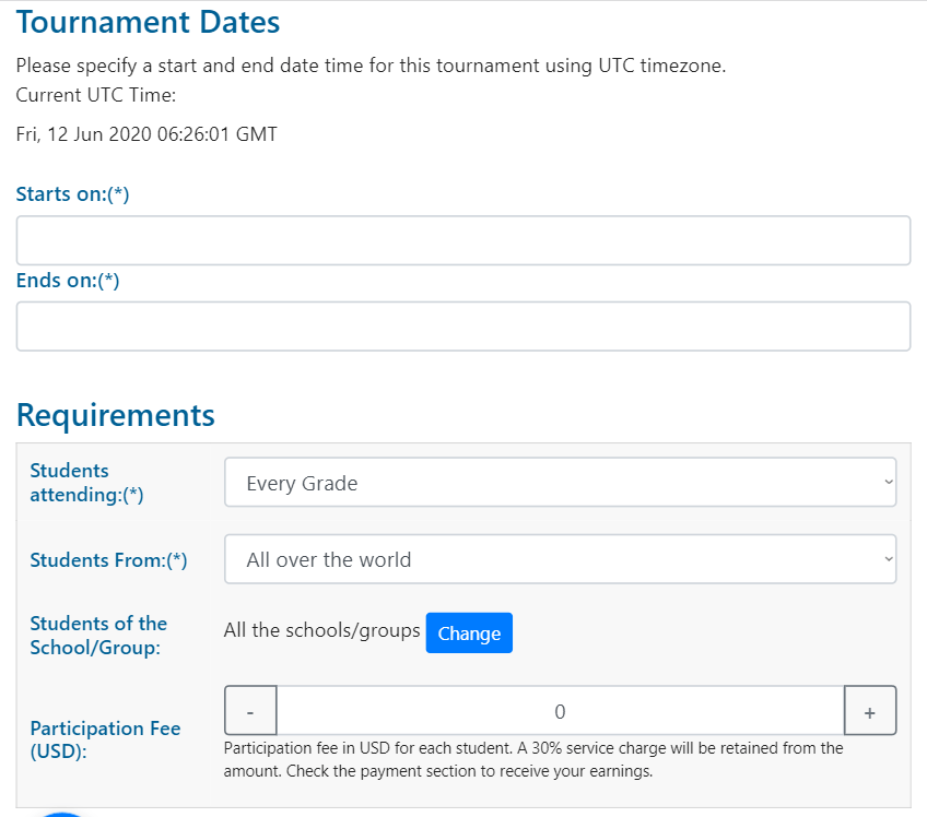 There are many options available to define a tournament, starting from the general info as name, description and country of the tournament (these are the only 3 mandatory) to some more specific switches such as the possibility to limit the participation to students of a given grade, country or school.