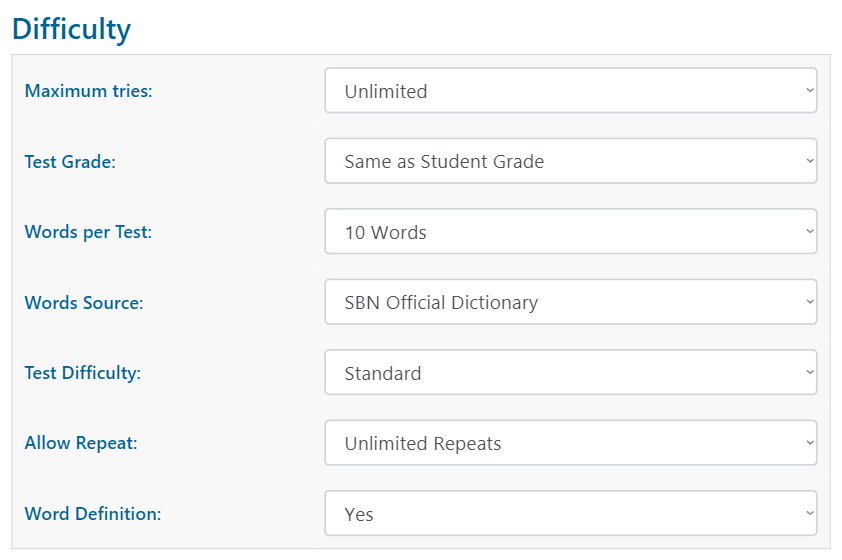 Of course there is a section dedicated to the spelling test parameters for this tournament, as shown in the image below: