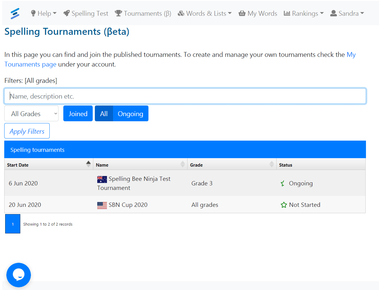 Once the required options are set and the start and end date are defined, the tournament is ready to be published and listed in the Tournament section of Spelling Bee Ninja.