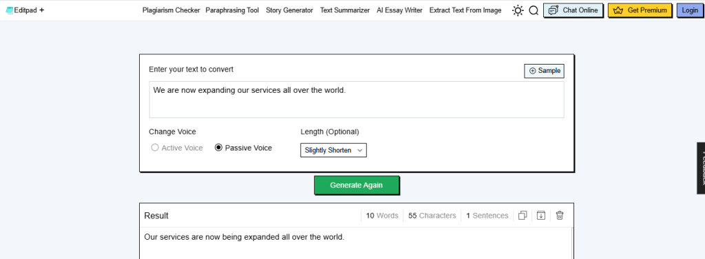 When it comes to features, the Editpad active-to-passive converter allows students to select the length of the sentence that is being converted. The options they will have are: Slightly shorten, Greatly reduce, Expand slightly, and Elaborate.