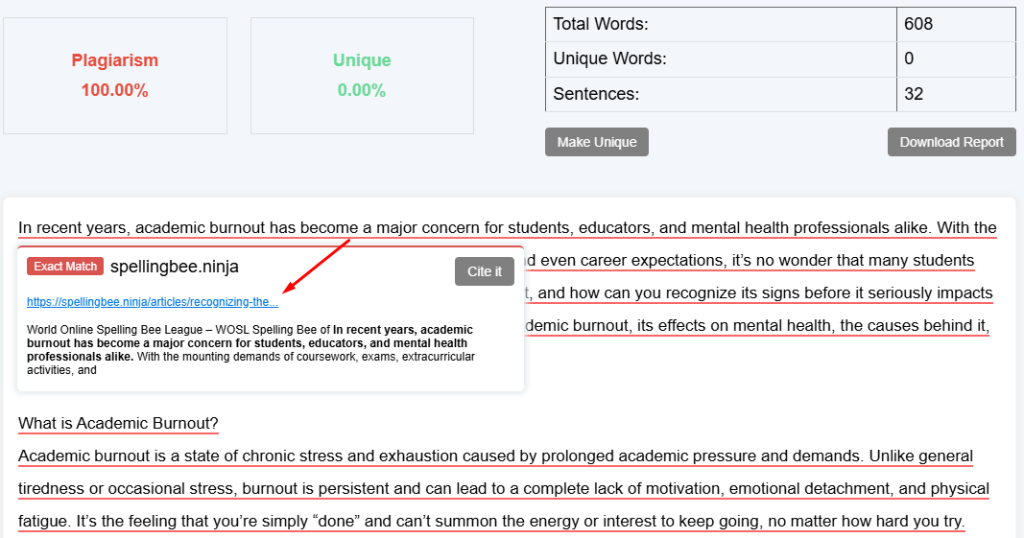 Editpad plagiarism not only highlights the duplicated sources but also mentions the overall percentage of both unique and plagiarized content. So that students can have an idea about the quality of their write-up.