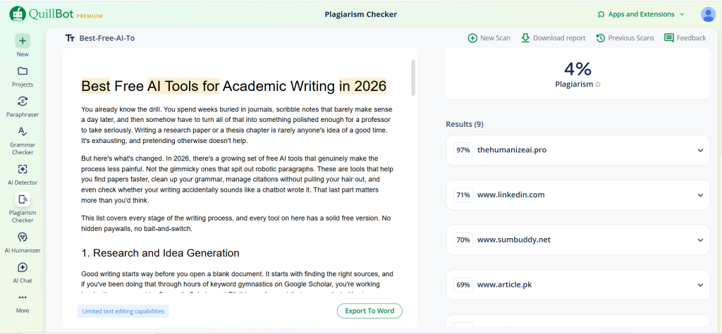Scribbr handles the traditional plagiarism side well. It cross-references academic databases and flags anything that matches existing work. But what a lot of students skip is the other half of the equation: checking whether their own writing might get flagged as AI-generated. That’s where running your draft through an AI content detector comes in. QuillBot’s AI content detector scans your text and highlights the parts that could be read as machine-written. Catching that before submission gives you a chance to rewrite those spots in a way that actually sounds like you. It’s quickly becoming one of those steps that smart students just bake into their workflow.